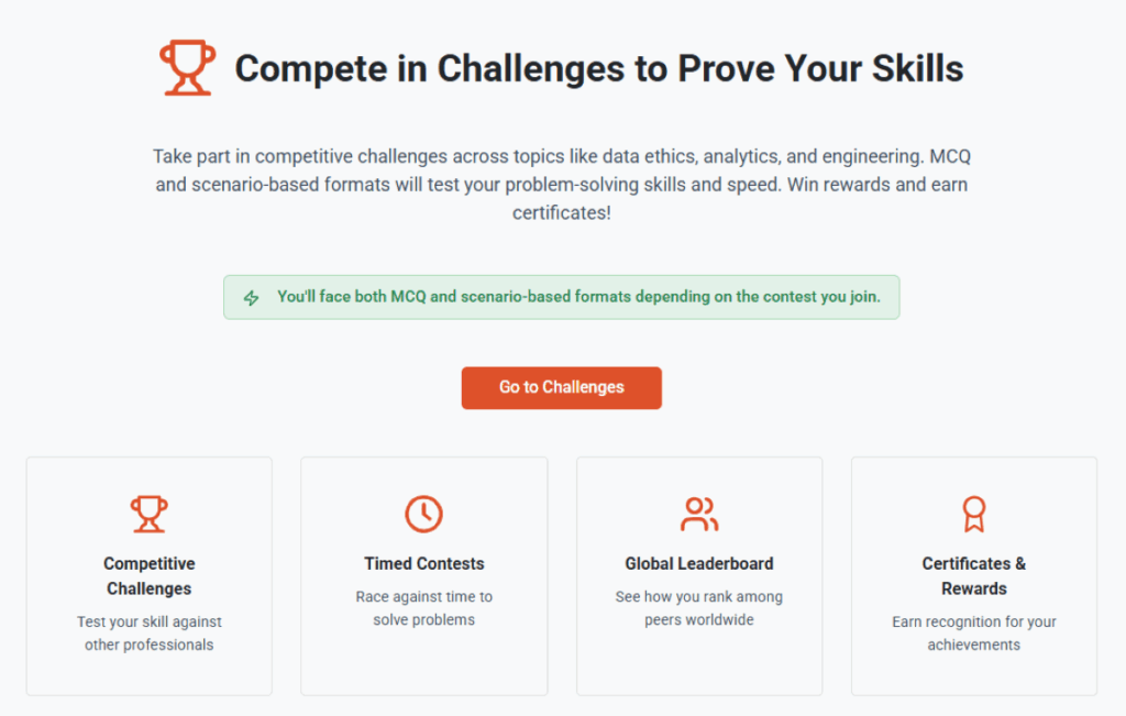 CompeteX also rewards top performers, with some challenges having a monetary reward. Other non-monetary rewards include certifications, public recognition, and recruiter visibility. These help individuals showcase their skills and advance their careers.